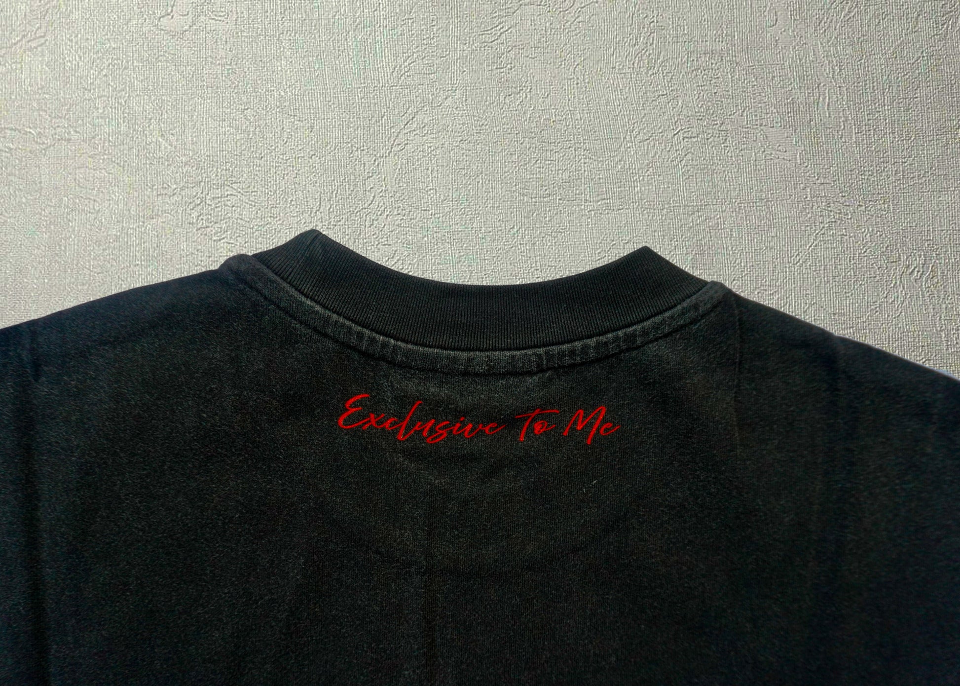 • Back: “Exclusive to Me” in bold red, centered between the shoulders