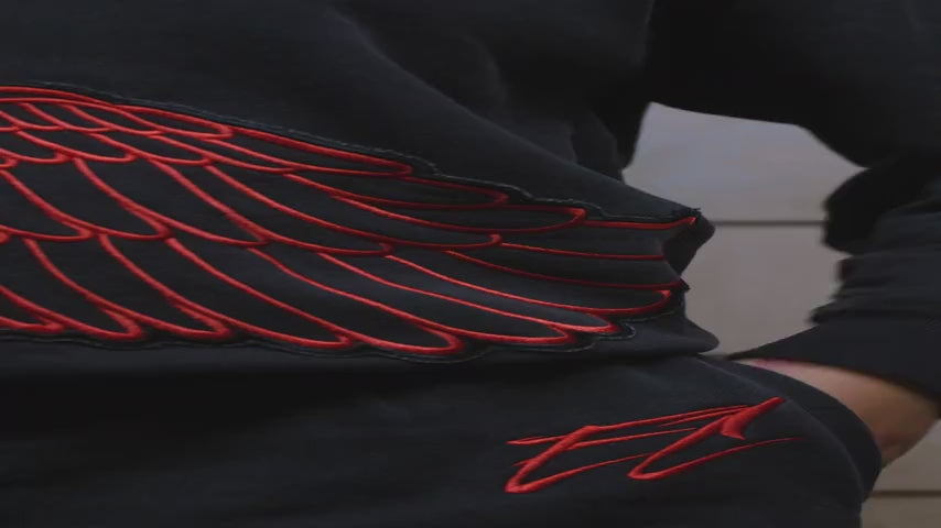 The signature embroidered wing graphic is placed on the pocket, adding a subtle but powerful statement at the front. On the back, a custom leather logo patch provides a premium contrast in texture and finish. Clean lines, thoughtful placement, and quality materials define the piece — nothing added without intention.